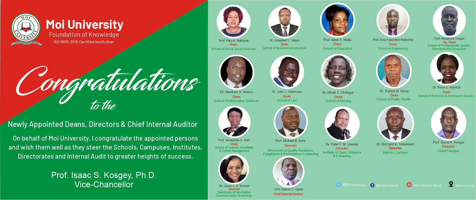 The Vice-Chancellor, Prof. Isaac S. Kosgey, on behalf of Moi University, wishes them well as they take up their new positions.